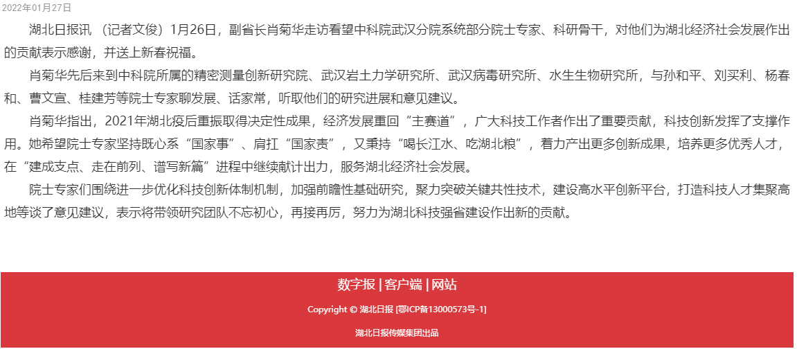 【湖北日报】肖菊华走访看望中科院在汉院士专家