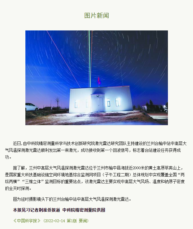 【中国科学报】兰州台榆中站中高层大气风温探测激光雷达顺利发出第一束激光