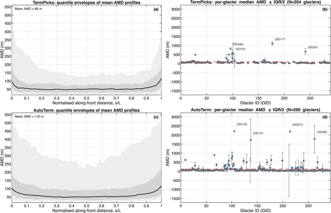 研究团队整合Landsat、Sentinel-1/2、MODIS、ENVISAT、ASTER和ERS等多源卫星遥感影像数据,构建了覆盖近二十年的高时空分辨率冰川前缘记录。顺利获得统一的标准化流程、人工解译与严格质量控制,显著提升了数据的一致性与精度。在精度验证方面,研究团队将GrTPD与国际主流数据产品进行系统对比。结果表明:GrTPD 和人工标注数据集 TermPicks 相比,平均最小距离误差(AMD)为86 米;和自动化产品 AutoTerm 相比,平均最小距离误差(AMD)为115米。整体来看,GrTPD表现出较高的位置精度与稳定性(图2)。在多冰川、多时间尺度对比中,GrTPD与人工数据TermPicks一致性更高(图3),而自动化方法在复杂观测条件下误差更为显著,进一步体现了该数据集作为高质量基准数据的可靠性。