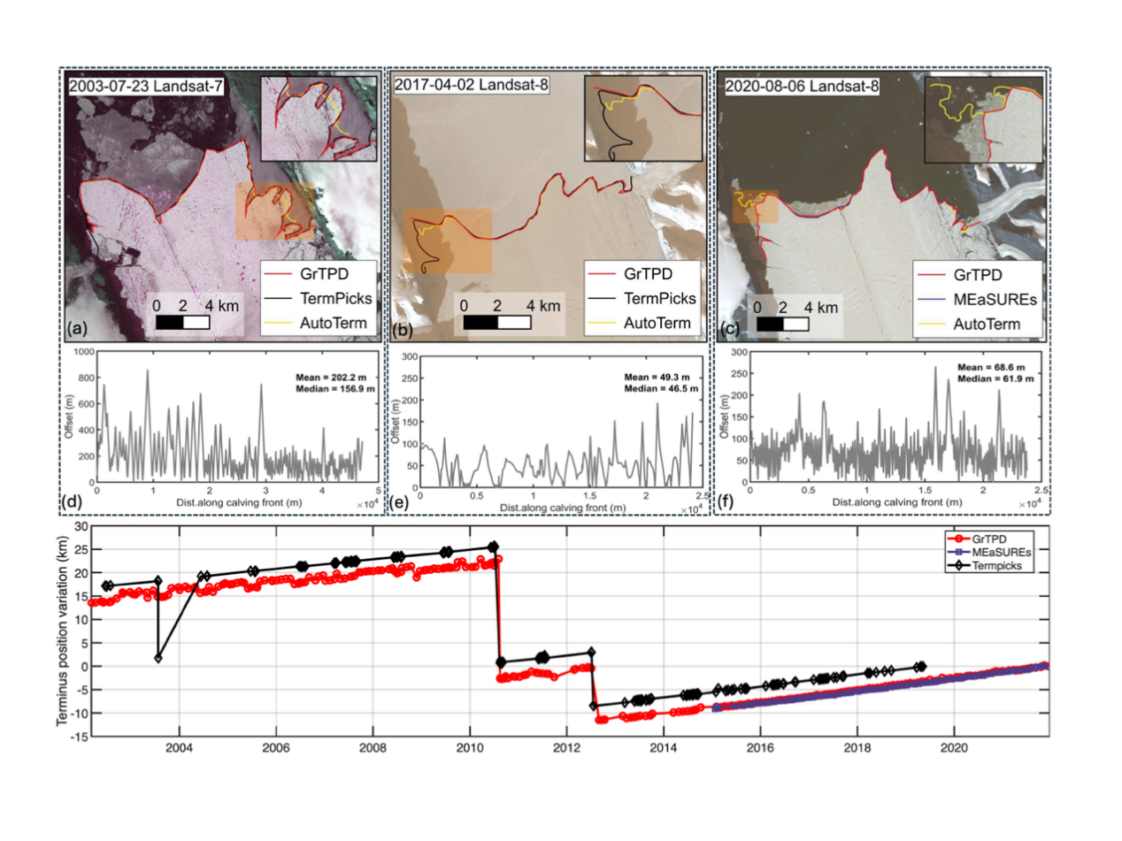 该数据集为格陵兰冰川前缘变化研究给予了关键观测基础,并在冰盖动力学模拟与海平面变化预测中具有很大应用潜力。作为高时空分辨率的时变边界条件,GrTPD可提升冰流模型对冰川退缩及其驱动机制的刻画能力,同时为自动化识别算法给予高质量训练与验证数据,支撑大尺度冰川变化监测与海平面变化评估。现在,GrTPD数据集已顺利获得Zenodo平台向全球开放共享(http://doi.org/10.5281/zenodo.19181770),为相关领域科研人员给予统一、高质量的数据基础,进一步促进冰川动力学研究与多学科交叉开展。