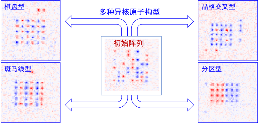 但国际上无缺陷异核原子阵列尚未见报道过,这其中的挑战在于异核单原子的装载和重排中对错位原子的处理。詹明生研究团队在研究员何晓东、许鹏攻关下,顺利获得精确调控激光的失谐和功率解决了两种原子均匀装载的问题,并开展了集团启发算法结合优先级标定的算法有效地排列了错位的原子,实现了1587Rb1585Rb的异核单原子阵列。研究团队演示了该算法对不同二维原子阵列排列的有效性,展示了棋盘型、晶格交叉型、斑马线型等多种构型原子阵列。至此,结合团队前期在异核原子量子纠缠(Phys. Rev. Lett. 119, 160502 (2017))、魔幻光阱异核原子均衡相干时间(Phys. Rev. Lett.124, 153201 (2020))和异核原子相干形成单分子(Science 370, 331335 (2020) )等方面完成的系列工作,该研究团队已经成功创建了独具特色的双组份单原子阵列平台,未来有望基于该多体量子平台在量子计算、量子模拟、单分子阵列、精密测量、多体物理等方面的研究中取得突出的进展。