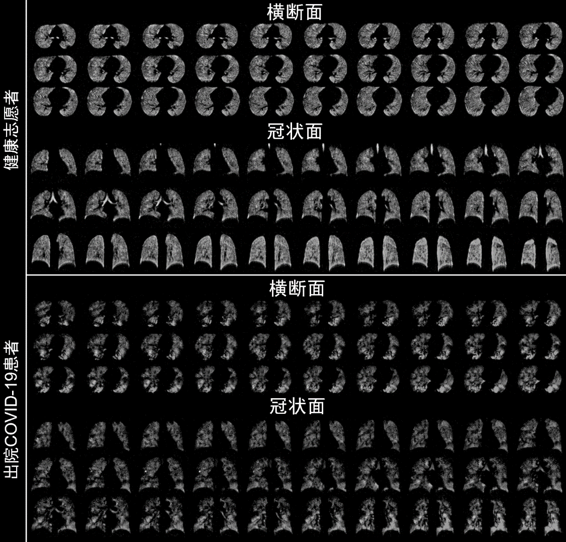 图4展示了健康志愿者和COVID-19出院患者的典型通气功能影像(空间分辨率为2.5 ×2.5×2.5 mm3),不论是在横断面还是冠状面均具有良好的成像效果。该健康志愿者和出院COVID-19患者的VDP分别为0.73%和7.12%。