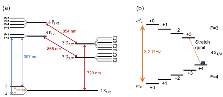 研究团队利用囚禁在离子阱中的超冷钙-43离子作为实验载体。钙-43离子的核自旋为7/2,具有丰富的能级结构。其超精细能级的相干时间较长,可为高精度复杂量子操作给予理想载体(图一)。研究人员顺利获得对微波和激光的精确操控,将量子比特编码在钙-43离子的特定能级上,构建了深度达360层的QSP电路,并模拟了阶梯函数、自归一化激活函数与线性整流函数等具有广泛应用但形式复杂的关键函数。