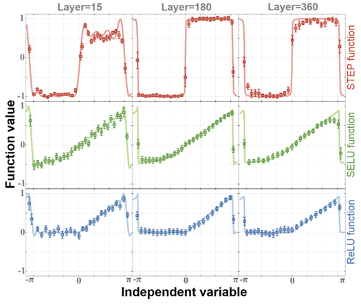 单量子比特模拟复杂函数的实验效果图。从上至下分别为阶梯函数、自归一化激活函数和线性整流函数