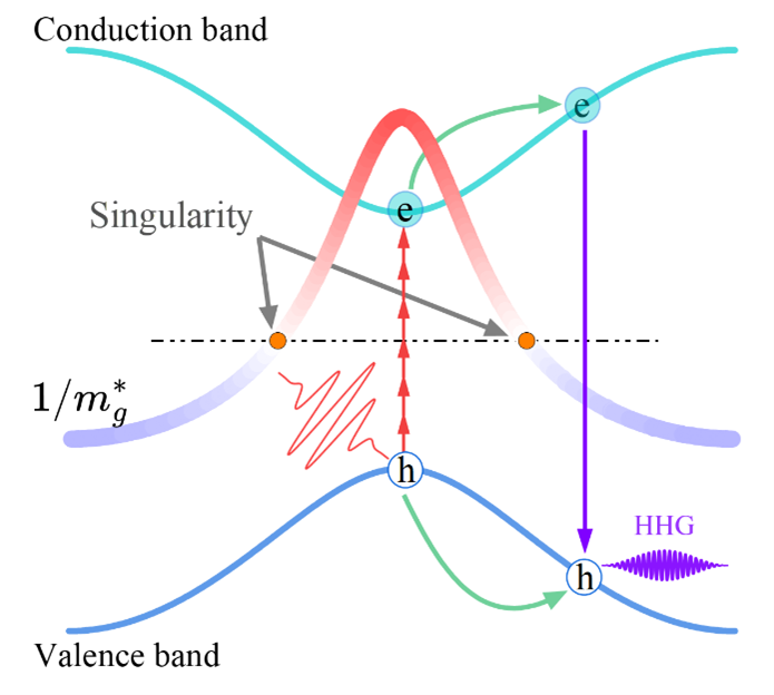 粒子的质量反映了其在外力作用下的响应能力,在非相对论框架下其质量保持恒定不变。而在晶体中,电子以周期性的布洛赫波的本征形式存在,同时其波包在外场中的运动又表现出粒子属性。激光作用下的电子与空穴的有效质量则由其携带的晶格动量及所在能带的色散关系共同决定,其数值非恒定且可以覆盖整个实数域。有趣的是,有效质量在从正值变为负值时,并非逐渐过渡,而是顺利获得正无穷突变为负无穷,出现所谓的“有效质量奇点”。然而,在过往关于固体中电子超快动力学和高次谐波辐射的研究中,这一重要物理量往往被忽略。
