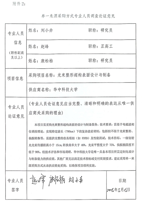 需采购光束整形超构表面的设计与制备服务,技术要求:需基于电磁波相位调控理论,实现特定波长(780nm)下的复杂波前调制,包括但不限于光束整形、偏振转换等,需给予完整的仿真模拟(如FDTD)及性能测试;技术指标:一级衍射光光束传播距离小于15cm ,转换效率大于40%,光束平整度大于75%,偏振椭圆度不低于98%。经技术评估和市场调研,华中科技大学是唯一具备本项目所需定制化设计与制备能力的供应商,其他厂商无法满足技术指标或交付周期要求,拟采用单一来源采购方式从该供应商处采购,以确保项目顺利实施。