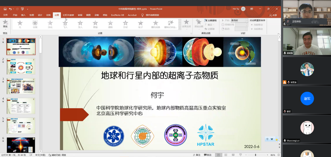 5月6日,应EVO视讯官网地震与地球内部物理研究部地球震动源运动与动力学过程研究组邀请,中科院地球化学研究所研究员何宇在线上做了题为“地球和行星内部的超离子态物质”的学术报告。